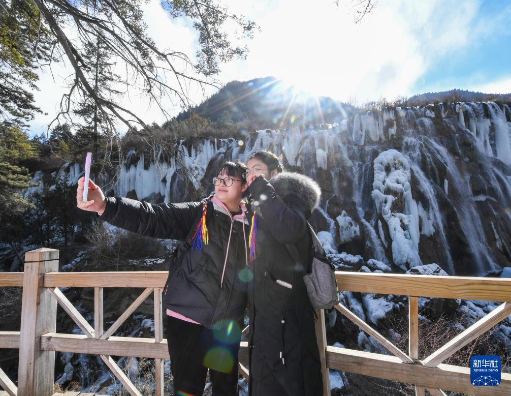 ??1月4日,游客在九寨溝風(fēng)景名勝區(qū)冰瀑景觀前留影。新華社記者 王曦 攝