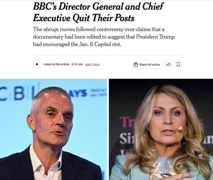 中新網(wǎng)11月10日電 綜合外媒報道,當(dāng)?shù)貢r間11月9日,因節(jié)目涉嫌剪輯拼接特朗普視頻,英國廣播公司(BBC)總裁蒂姆·戴維與新聞部門首席執(zhí)行官黛博拉·特內(nèi)斯辭職。