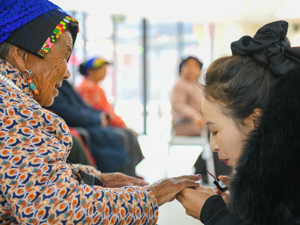 在馬爾康市老年養(yǎng)護(hù)院,格西王姆為85歲的老人澤郎斯基擦指甲油(2月19日攝)。新華社記者 王曦 攝