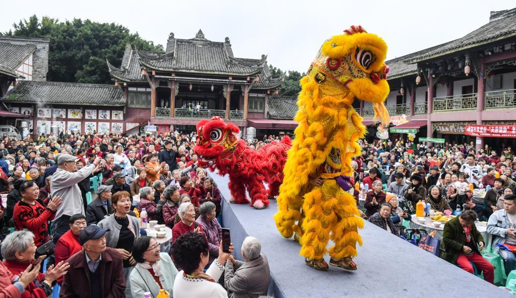 10月28日,在四川省成都市雙流區(qū)黃龍溪鎮(zhèn),演員為參加“長壽壩壩宴”的老人表演舞獅,迎接重陽節(jié)。新華社發(fā)(李向雨 攝)
