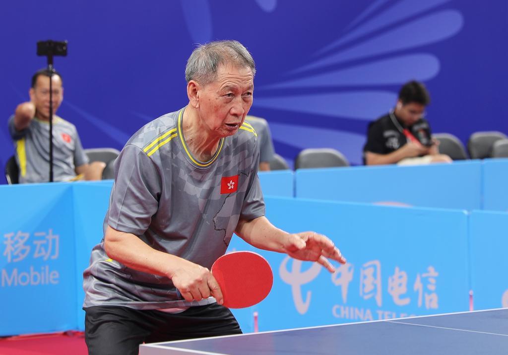 香港選手張耀釗在第十五屆全國運(yùn)動(dòng)會(huì)群眾比賽乒乓球比賽中。(組委會(huì)供圖)