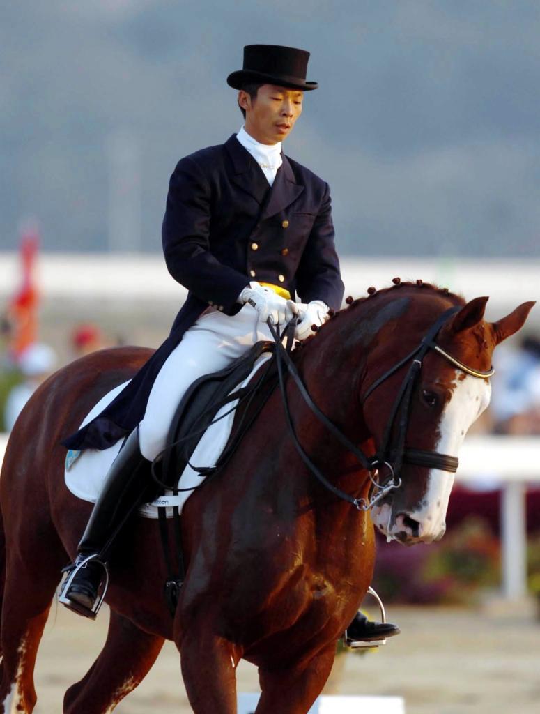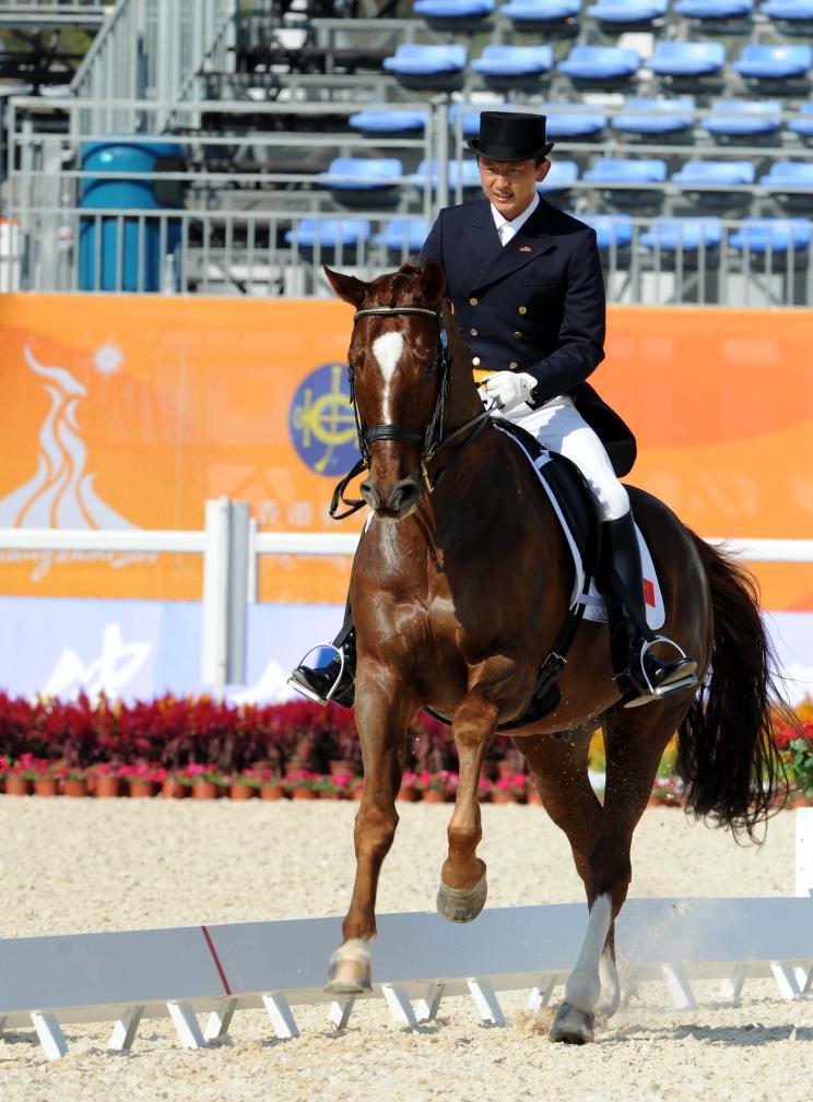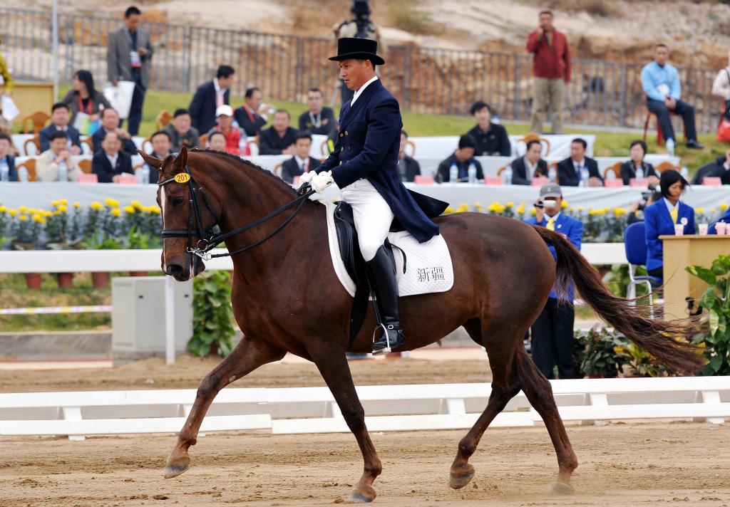 2010年11月14日,中國隊(duì)選手顧兵在第16屆亞運(yùn)會(huì)馬術(shù)盛裝舞步團(tuán)體比賽中。新華社記者 楊宗友 攝