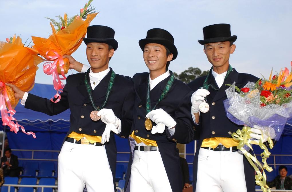2002年10月8日,中國隊(duì)選手黃焯欽、顧兵、張立軍(從左至右)在頒獎(jiǎng)儀式上。在當(dāng)日進(jìn)行的第14屆亞運(yùn)會(huì)馬術(shù)盛裝舞步團(tuán)體賽中,中國隊(duì)獲得銅牌,實(shí)現(xiàn)了該項(xiàng)目在國際大賽上的歷史性突破。新華社記者 劉大偉 攝