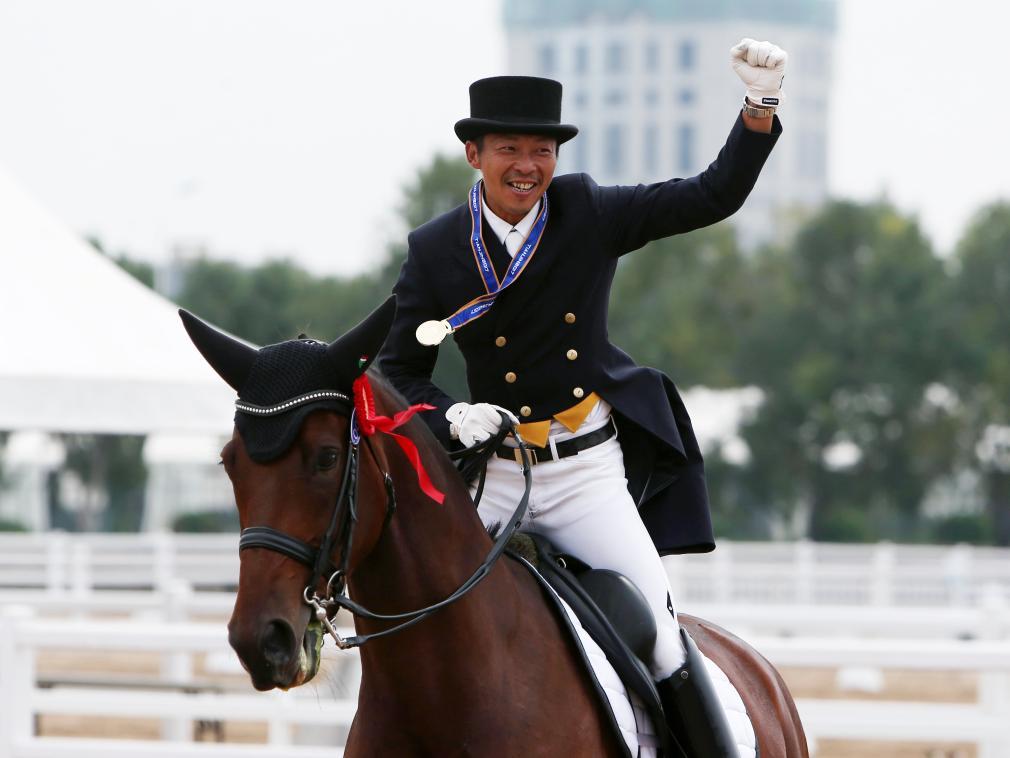2017年9月4日,黃焯欽在第十三屆全國運(yùn)動(dòng)會(huì)馬術(shù)盛裝舞步個(gè)人賽后慶祝奪冠。新華社記者 張譽(yù)東 攝
