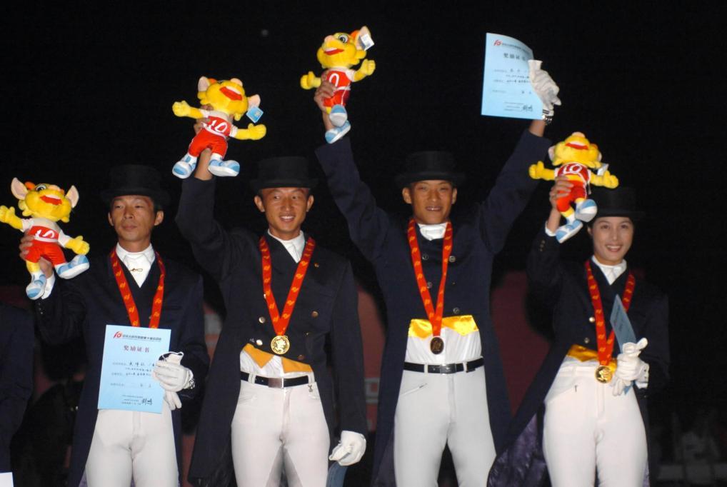 2010年11月14日,中國隊(duì)馬術(shù)選手在頒獎(jiǎng)儀式上。當(dāng)日,在第16屆亞運(yùn)會(huì)馬術(shù)盛裝舞步團(tuán)體比賽中,中國隊(duì)獲得亞軍。新華社記者 楊宗友 攝