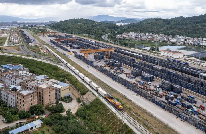 前往老撾萬象的國際貨物列車駛出中老鐵路玉溪研和站(2025年8月23日攝,無人機照片)。新華社記者 陳欣波 攝