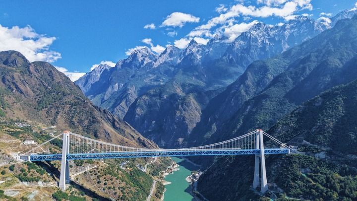 這是全長882.5米的虎跳峽金沙江鐵路大橋。大橋起于玉龍雪山隧道出口,止于哈巴雪山隧道進口,是麗香鐵路的重點控制性工程(2025年11月21日攝,無人機照片)。新華社發(fā)(楊紫軒攝)