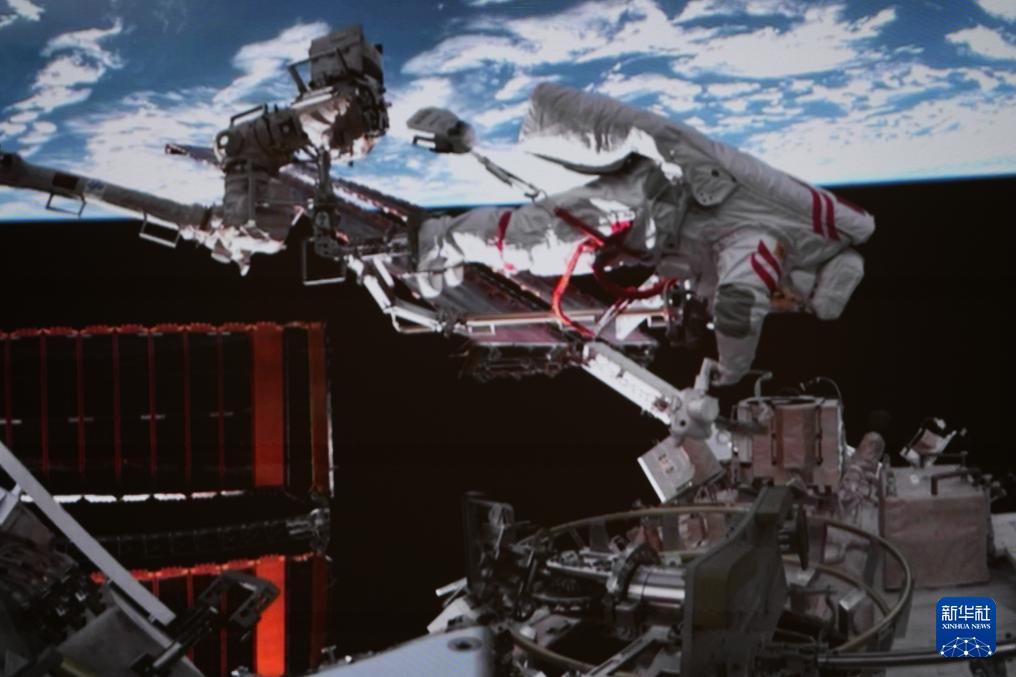 這是12月9日在北京航天飛行控制中心屏幕上拍攝的神舟二十一號乘組航天員張陸與武飛(右)在艙外工作的畫面。新華社記者 劉藝 攝