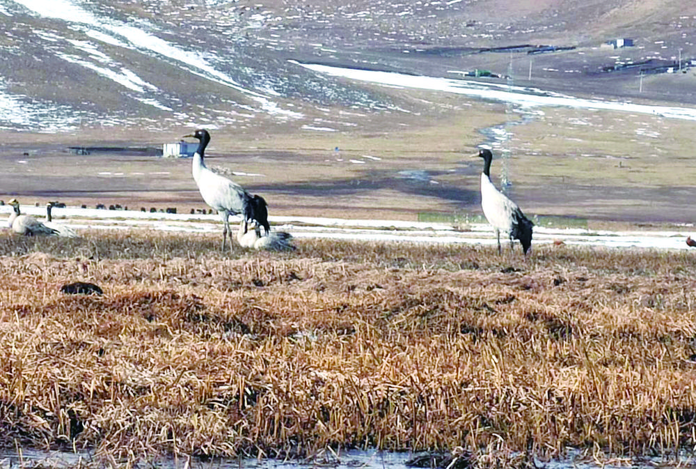 當(dāng)日早上10時(shí),生態(tài)管護(hù)員昂文才仁用單筒望遠(yuǎn)鏡進(jìn)行日常巡查時(shí)發(fā)現(xiàn)黑頸鶴的身影,幾只黑頸鶴在剛剛解凍的湖泊中嬉戲。隨后,昂文才仁喊來(lái)其余幾名生態(tài)管護(hù)員,共同開展監(jiān)測(cè)。經(jīng)過(guò)幾人一早上的監(jiān)測(cè),確定首批飛抵隆寶灘國(guó)際重要濕地的黑頸鶴共8只。