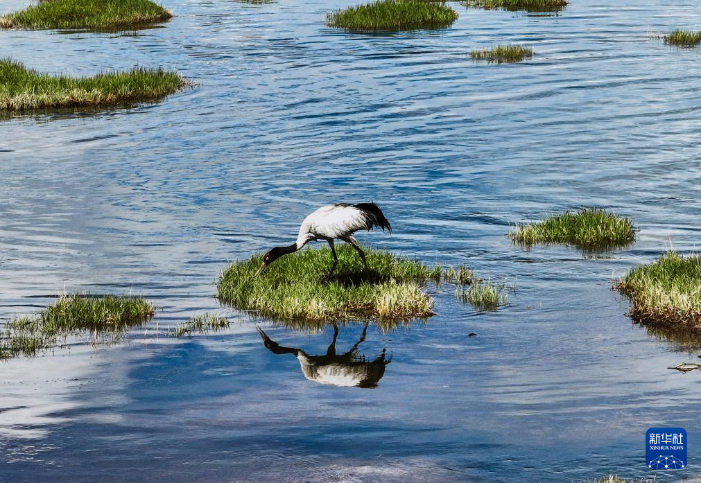 這是6月4日在青海隆寶國家級自然保護(hù)區(qū)拍攝的黑頸鶴(無人機(jī)照片)。新華社 杜笑微 攝