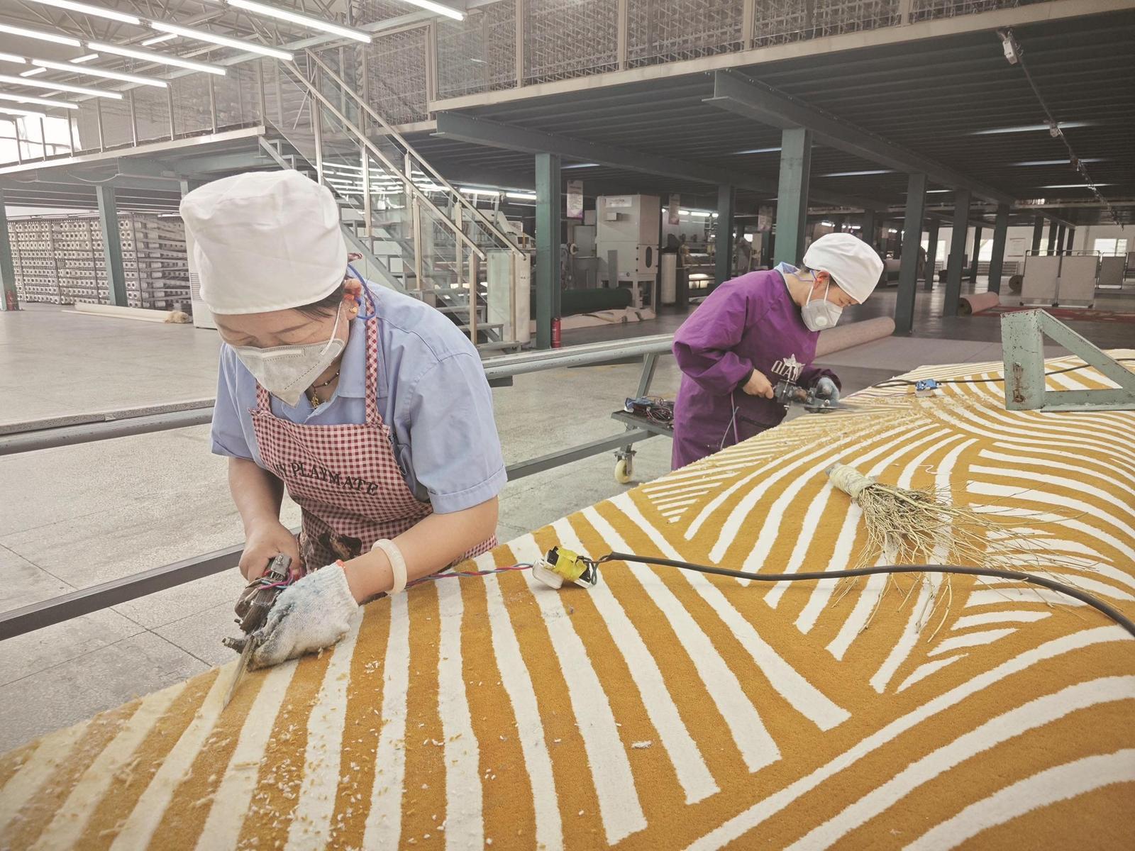 技術(shù)的革新還體現(xiàn)在新型阿克明斯特機(jī)織與手工槍刺結(jié)合的生產(chǎn)線——80%機(jī)織打底、20%手工精修,價格比純手工低,還保留80%的工藝質(zhì)感。2024年,3萬平方米的年產(chǎn)量中,有1.2萬平方米用于國外高端酒店。