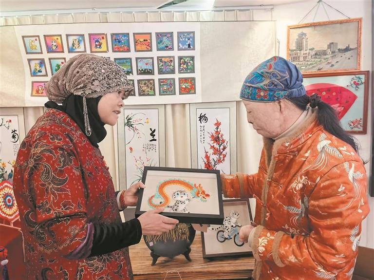 一句邀請,為葉啟蓮?fù)崎_了一扇通往“娘家”的大門,也走進(jìn)了這個(gè)由漢、回、藏、土、撒拉等多民族姐妹組成的大家庭。盡管民族不同、繡法各異,可聚到一起,大家就有聊不完的話題。你教我盤線,我?guī)湍闩渖?,連午飯都湊在一起吃——回族的面片、撒拉族的點(diǎn)心……擺在一起就是一桌熱鬧的“團(tuán)結(jié)飯”。