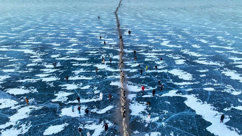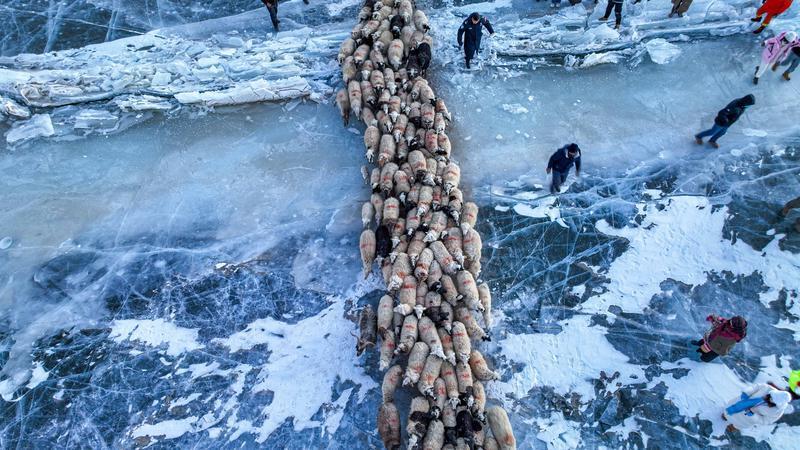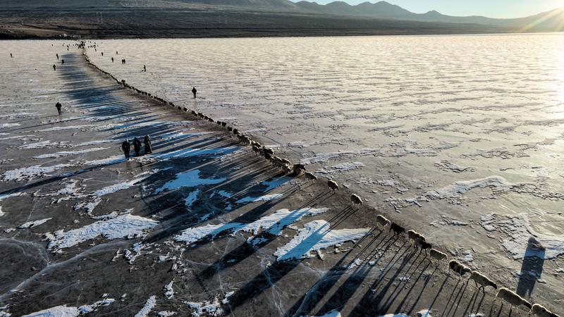 去往湖心島的路程大約3公里,走在冰面上,偶爾響起的冰層破裂聲還是讓人不由得心驚。此刻,幾百只羊宛如一條長長的直線,在牧羊人的指揮下緩慢前行。金色的太陽露出地平線,羊群的影子投射在藍(lán)色的冰面上,美不勝收。
