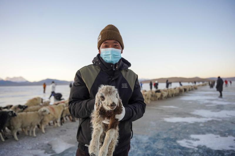 早上8點(diǎn)左右,趕羊正式開始。幾名牧羊人先行一步在冰面撒上爐灰,一名牧羊人抱著小羊踏上冰面,身后是羊群在冰湖上緩慢前行。還有兩名牧羊人牽著牧羊犬,與其他牧羊人一起分列兩側(cè),維持秩序。