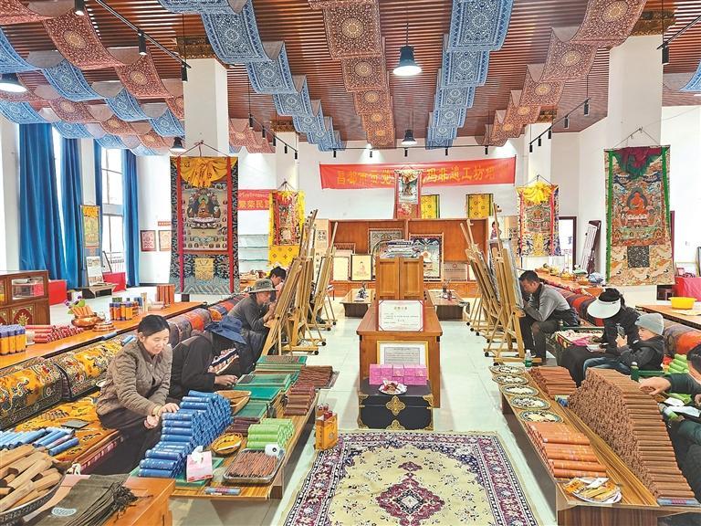 黨建引領(lǐng),產(chǎn)業(yè)提質(zhì)。在當?shù)攸h委、政府的大力扶持下,政策引導(dǎo)、資金注入、平臺搭建等利好舉措相繼落地。短短4年間,貢覺縣桑珠榮村一處不起眼的廠房華麗轉(zhuǎn)身,變?yōu)樯V闃s村民族手工業(yè)孵化基地,堤無瑪藝術(shù)傳承合作社也應(yīng)運而生,成為該村的集體經(jīng)濟組織。