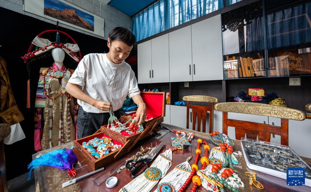 班珠丹塔在家中工作室內(nèi)整理自己做的藏式配件(9月11日攝)。新華社記者 丁增尼達(dá) 攝