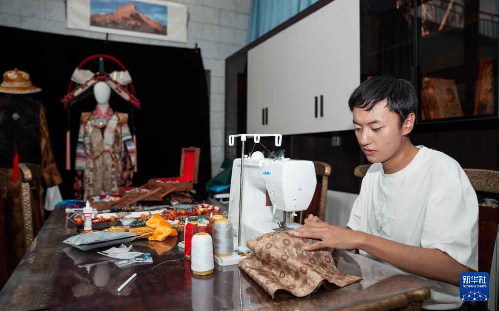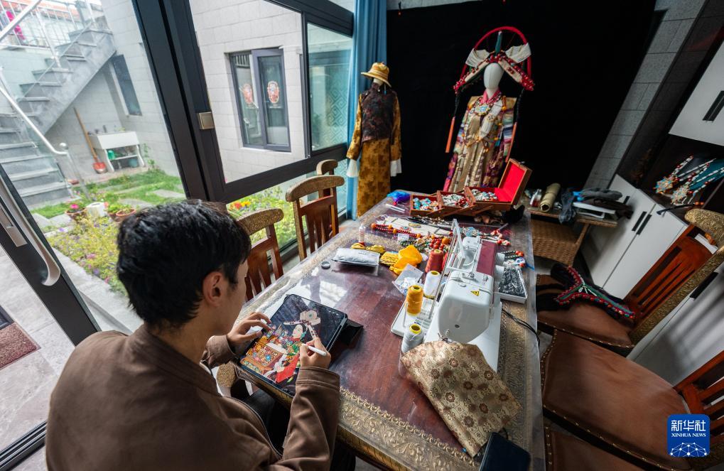 班珠丹塔在家中工作室設(shè)計(jì)藏裝(9月11日攝)。新華社記者 丁增尼達(dá) 攝