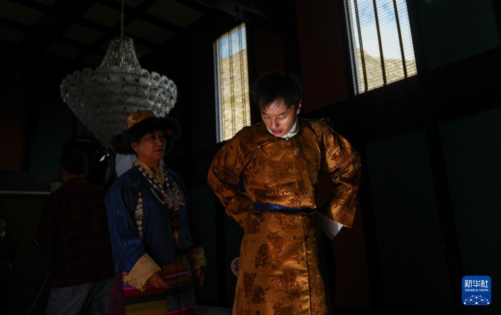 班珠丹塔(右)在穿自己設(shè)計(jì)的男士旅行服(9月9日攝)。?新華社記者 晉美多吉 攝