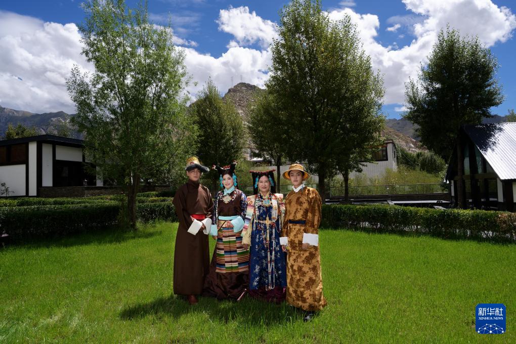 班珠丹塔(右一)和模特合影留念,模特們穿著由他設(shè)計(jì)的藏裝(9月9日攝)。新華社記者 張笑宇 攝