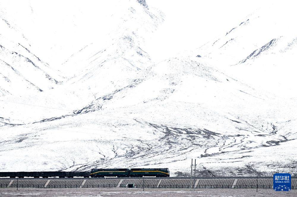 列車行駛在昆侖山下的青藏鐵路上(5月27日攝)。新華社記者 張龍 攝