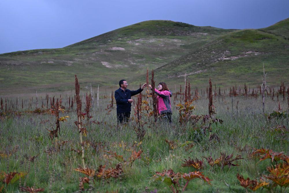 2023年9月5日,科技工作者在青海省果洛藏族自治州一處“草藥間種”的黑土灘治理試驗(yàn)田中收集唐古特大黃種子。新華社記者 張龍 攝