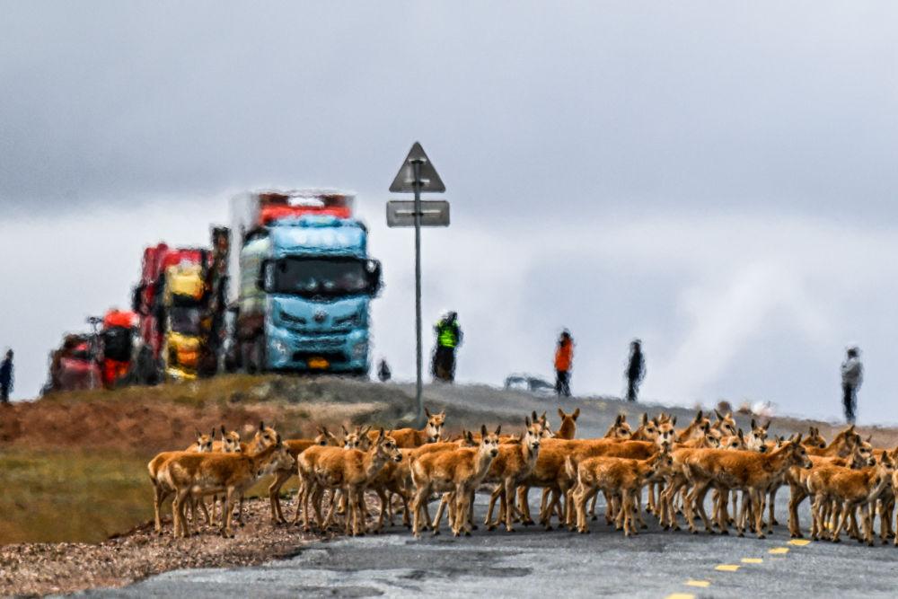 2024年5月27日,藏羚羊在青海省可可西里五道梁地區(qū)通過青藏公路。新華社記者 張龍 攝