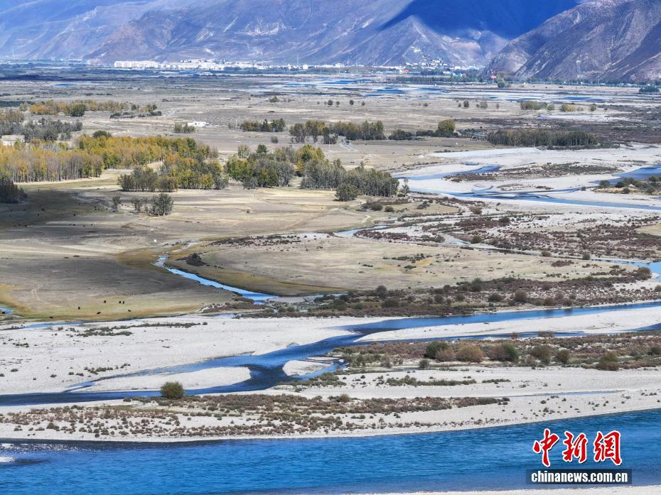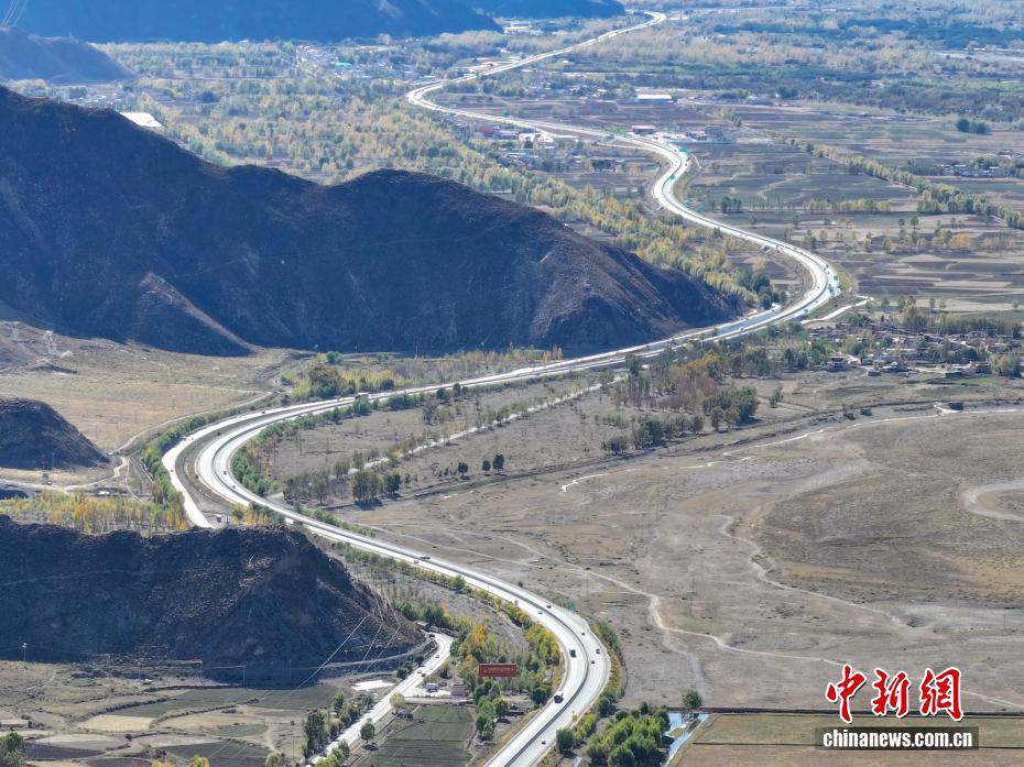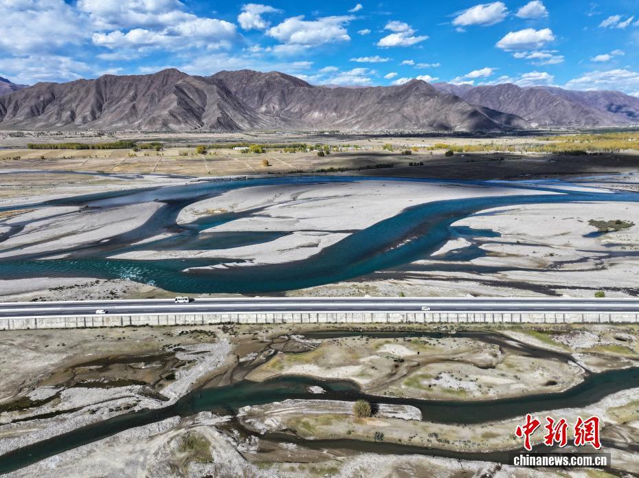 10月15日,西藏自治區(qū)拉薩市墨竹工卡縣境內(nèi)的拉薩河兩岸進(jìn)入最美秋季,澄澈河水映襯著藍(lán)天白云,沿線村莊與拉薩至林芝高等級(jí)公路相映成趣,美景如畫。(無(wú)人機(jī)照片)中新社記者 貢嘎來(lái)松 攝