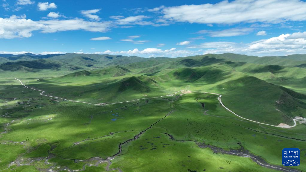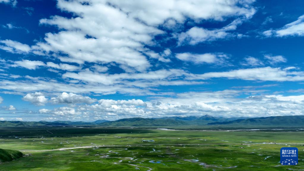 這是瑪曲縣河曲馬場的濕地草原景色(7月5日攝,無人機照片)。新華社記者 方欣 攝