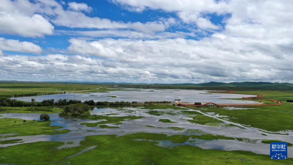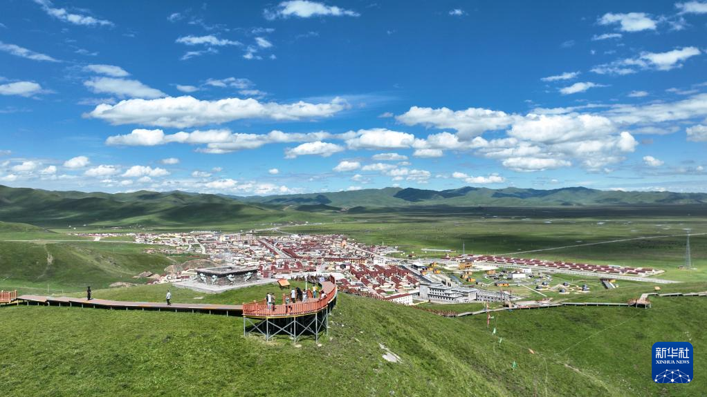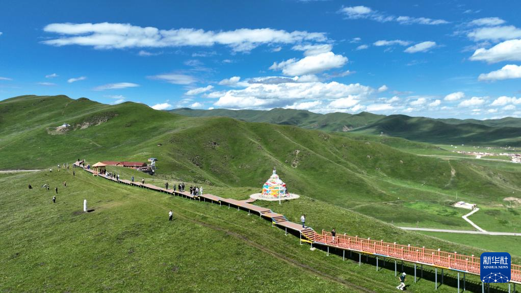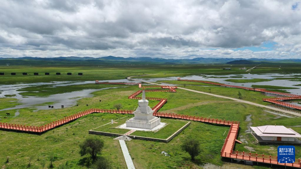 游客在甘南藏族自治州瑪曲縣阿萬倉濕地的觀景步道上游覽(7月6日攝,無人機照片)。新華社記者 陳斌 攝