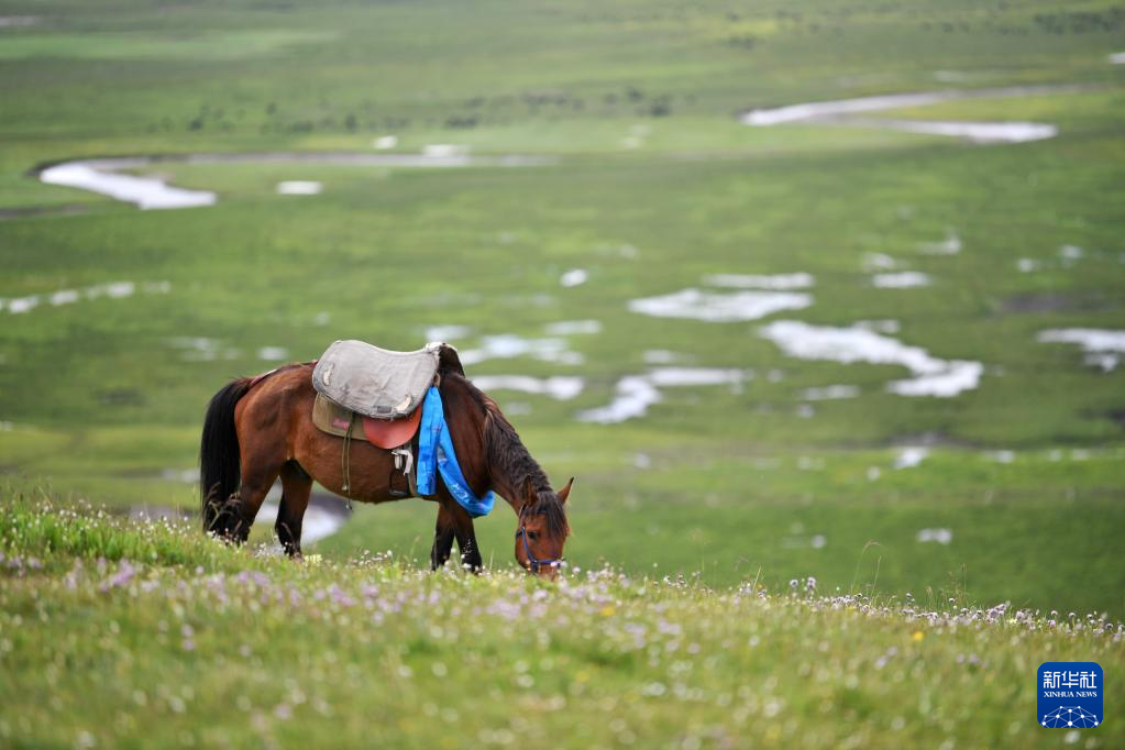 一匹馬在瑪曲縣阿萬倉濕地上吃草(7月6日攝)。新華社記者 方欣 攝