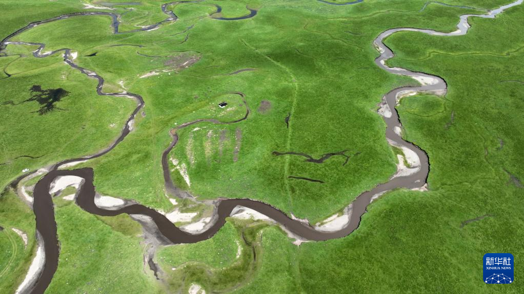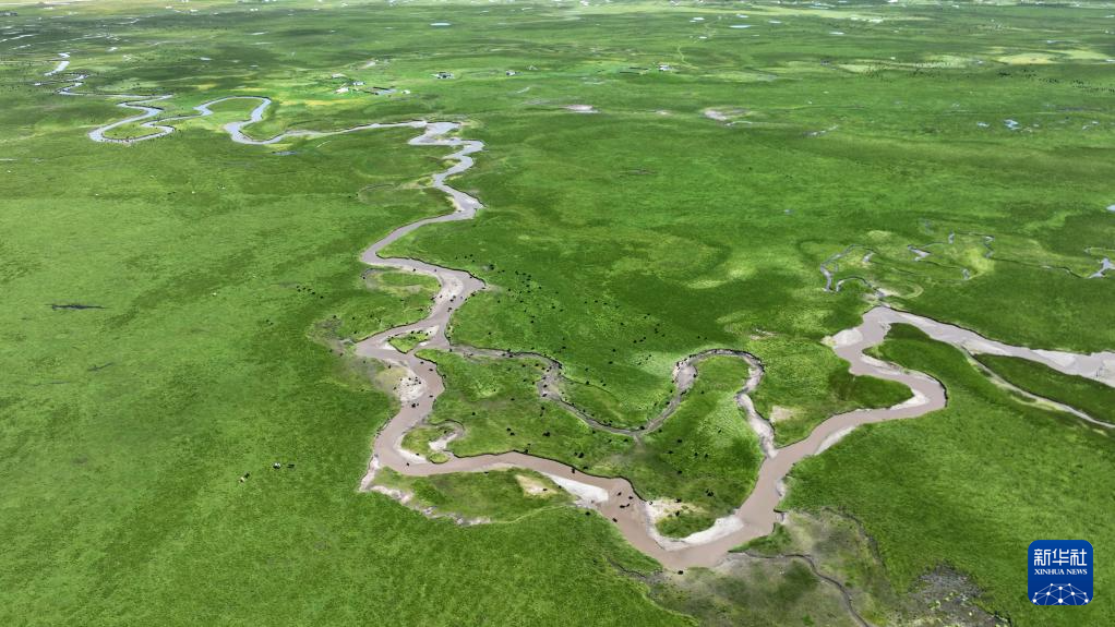 這是瑪曲縣河曲馬場的濕地草原景色(7月5日攝,無人機照片)。新華社記者 陳斌 攝