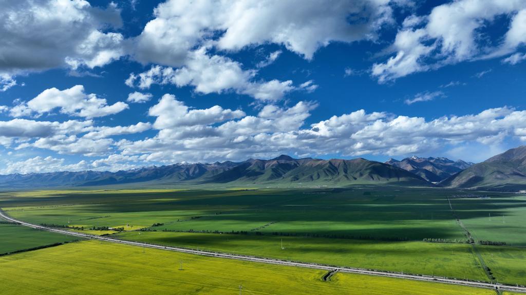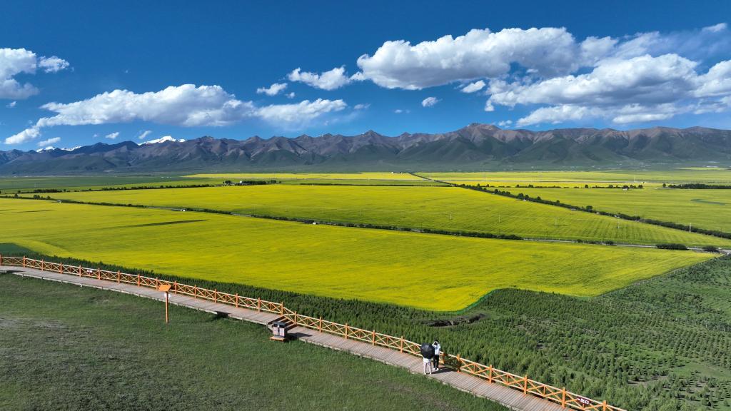 夏日,在位于祁連山腹地的青海省海北藏族自治州門源回族自治縣境內(nèi),油菜花競(jìng)相綻放,花海、雪山、草原共同組成色彩斑斕的祁連山夏日畫卷。