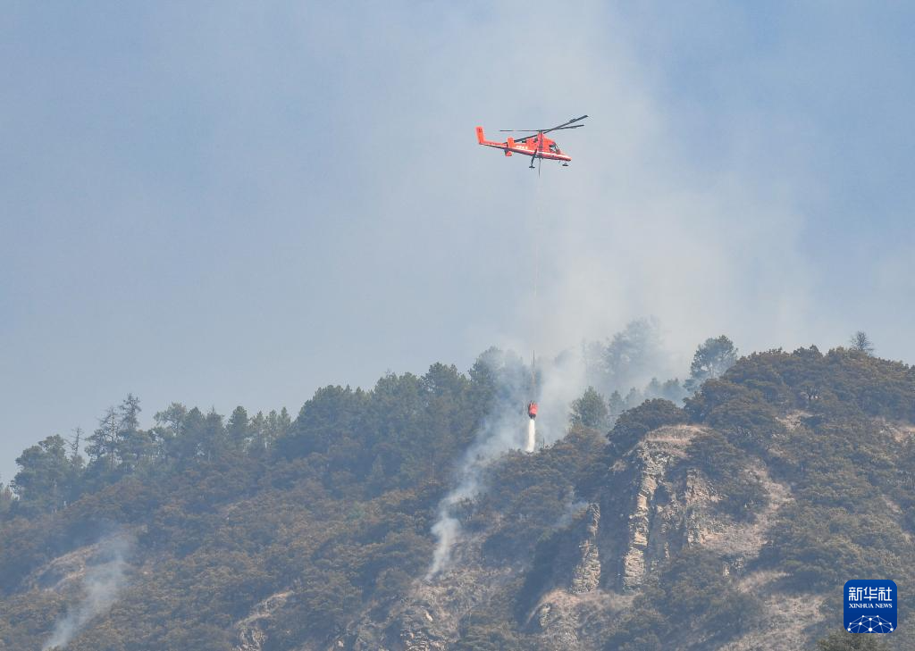 3月18日,直升機(jī)對雅江縣森林火災(zāi)2號火場進(jìn)行吊桶滅火灑水作業(yè)。新華社記者 王曦 攝