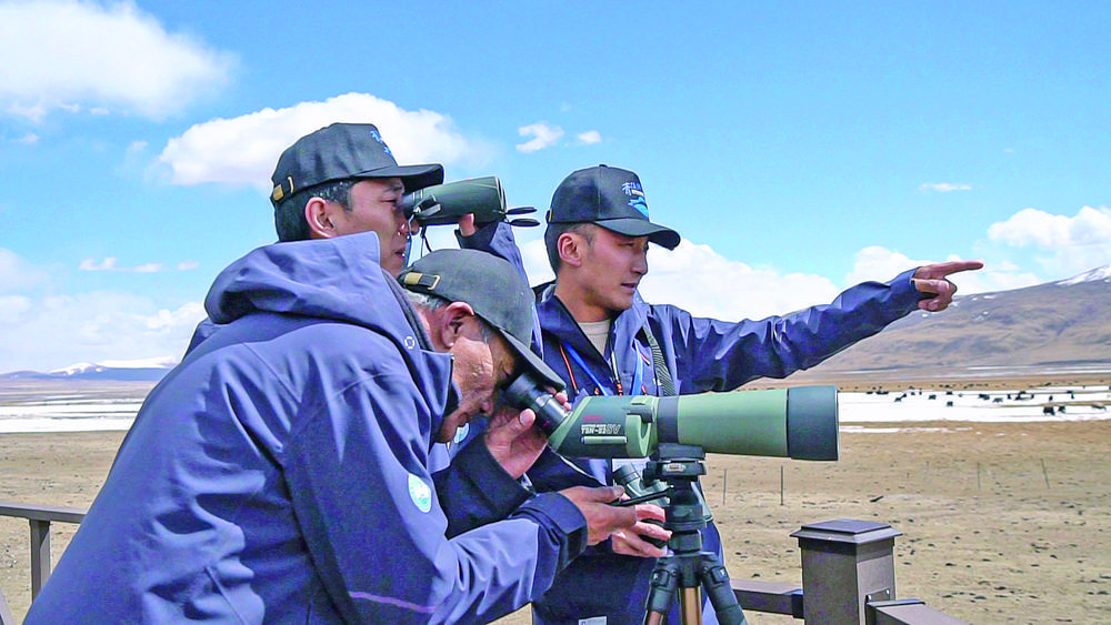 巴桑才仁(中)與管護(hù)員觀測(cè)鳥(niǎo)類(lèi)。張得俊 攝