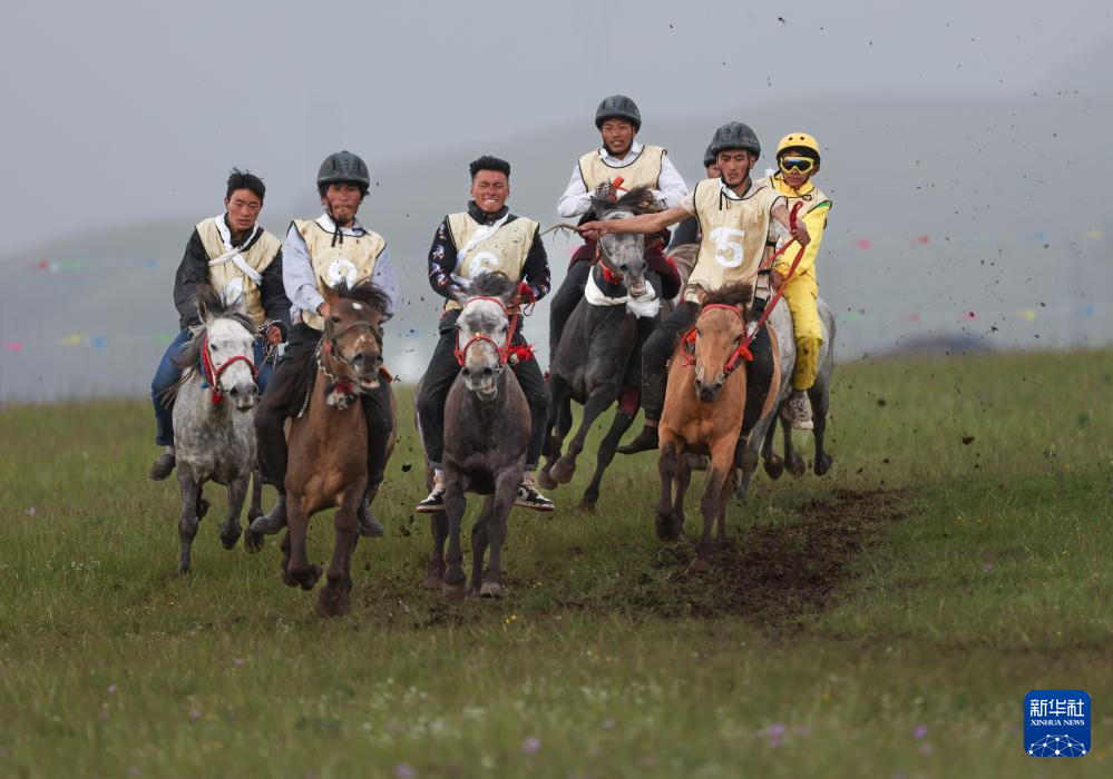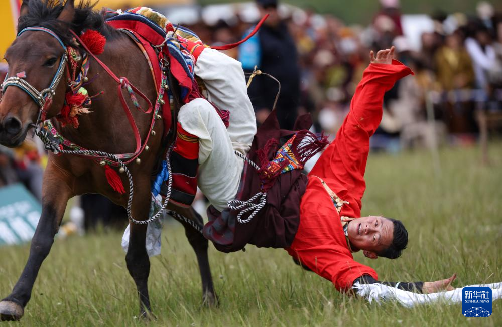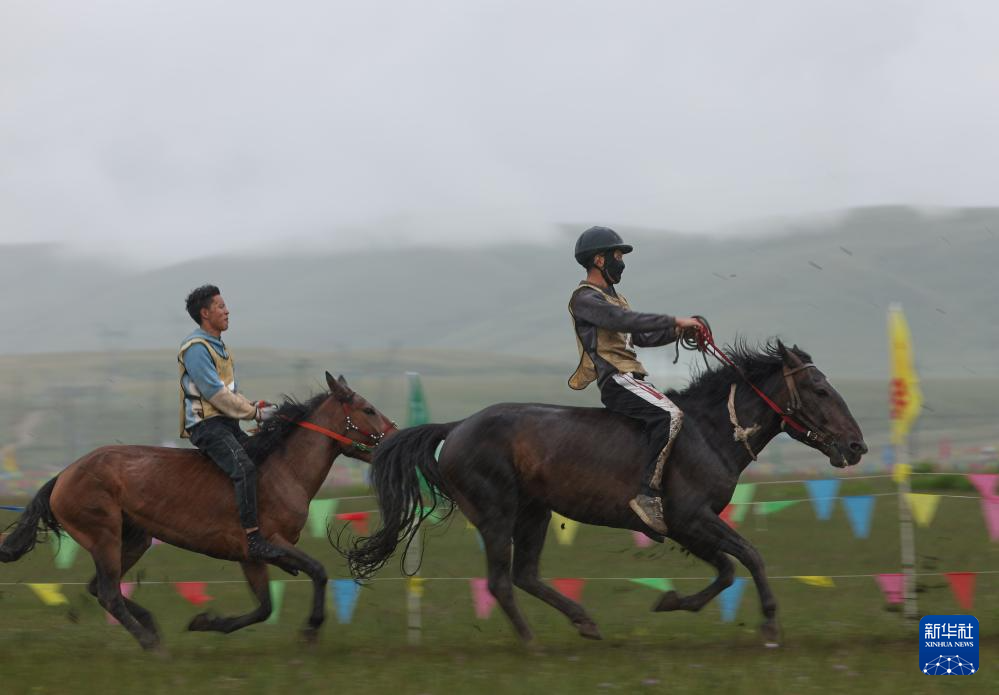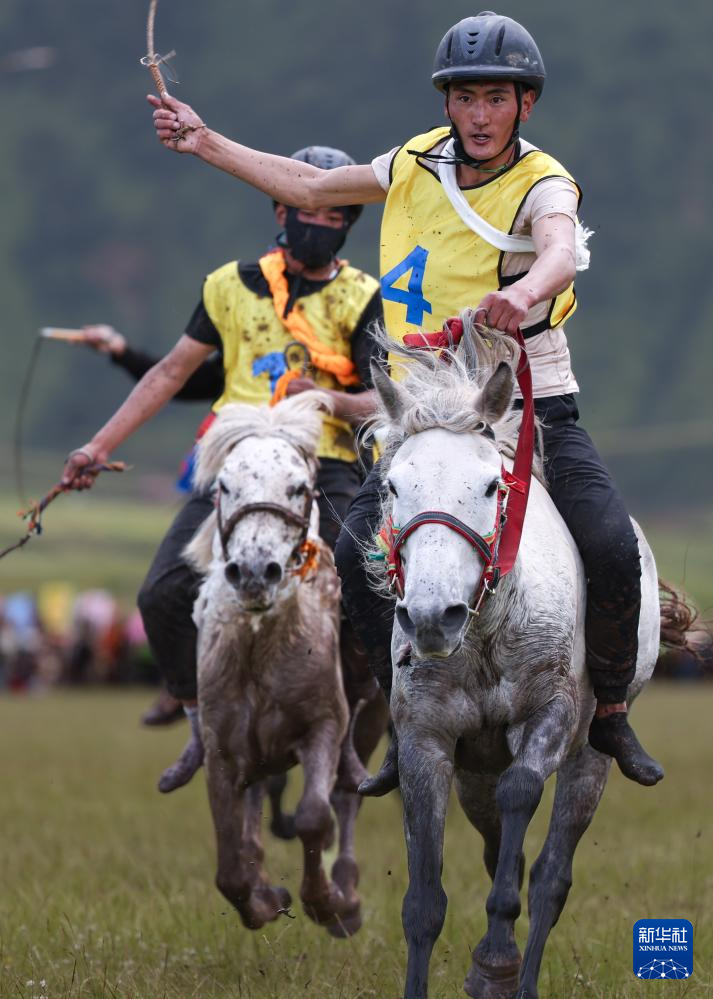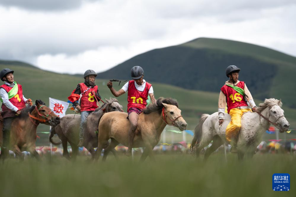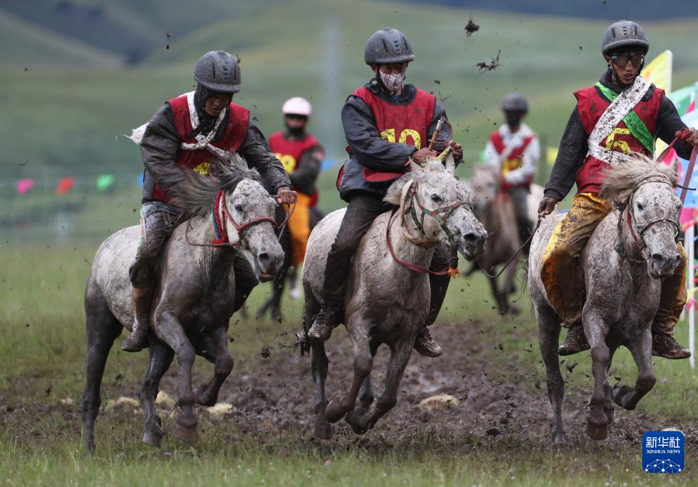 7月28日,當?shù)厝罕娫趨⒓域T馬拾哈達比賽。新華社記者 江宏景 攝