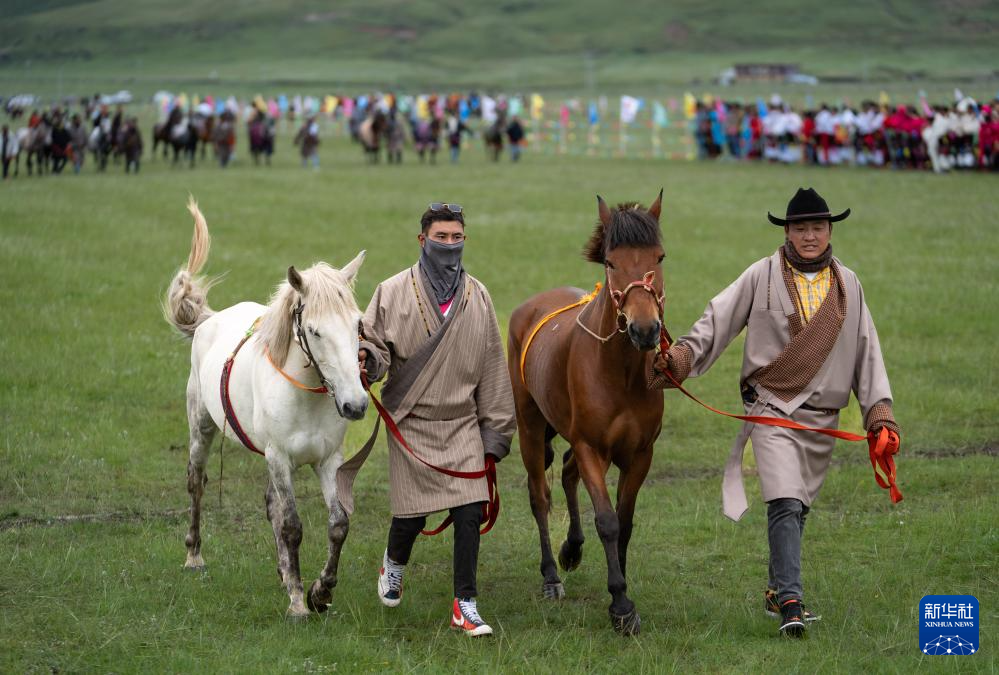 7月27日,兩名藏族群眾牽著馬走進賽場。新華社記者 江宏景 攝