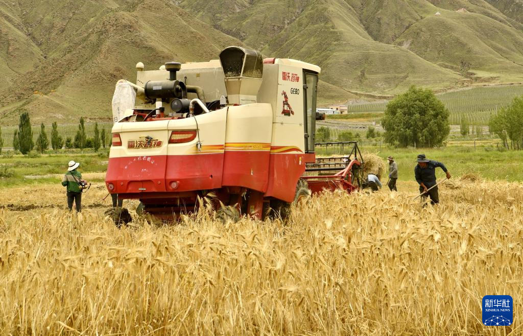 7月31日,聯(lián)合收割機(jī)在山南市扎囊縣扎其鄉(xiāng)朗賽嶺村的農(nóng)田里收割青稞。新華社記者 張汝鋒 攝