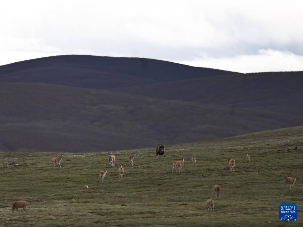 7月8日,在可可西里卓乃湖區(qū)域,棕熊準備捕獵藏羚羊。新華社記者 張龍 攝
