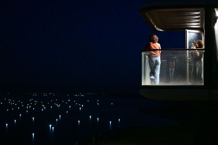 “我這會兒下網(wǎng),等到凌晨1點再出船起網(wǎng)。天快亮了,帶著一箱箱小銀魚回來?!痹S昌邊固定船錨邊說。十多年來,他每年漁期都在湖邊度過——凌晨出船,拂曉而歸。說話間,他回到岸邊帳篷,拉下電閘。眨眼間,一串串漁燈亮起,融入湖面燈海。