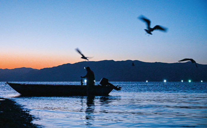 翌日清晨,我早早來到昨日遇到許昌的岸邊,想拍攝他們捕魚歸來的畫面。高原的天亮得晚,6點仍是一片漆黑。幾只漁船正向岸邊駛來,船上漁民們的頭燈揮出長長的光束,在銀色的水波間勾勒出搖曳的船影。他們抬著一箱箱小銀魚上岸,依次過秤。一位收魚人給漁民們記賬、將魚箱裝車。他告訴我,收魚人也是凌晨來到岸邊,收好魚就運往附近的加工廠。在這里,晝夜溫差極大,寒氣裹挾著水汽,10月初就濕冷無比。而漁民們十幾年如一日在湖面打魚,為的就是每天凌晨起網(wǎng)豐收的喜悅。