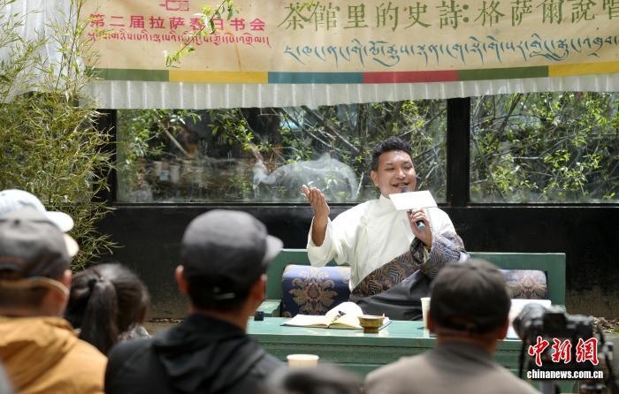 2025年4月20日,格薩爾說唱藝人斯塔多吉在拉薩甜茶館里演繹格薩爾說唱。中新社記者 李林 攝