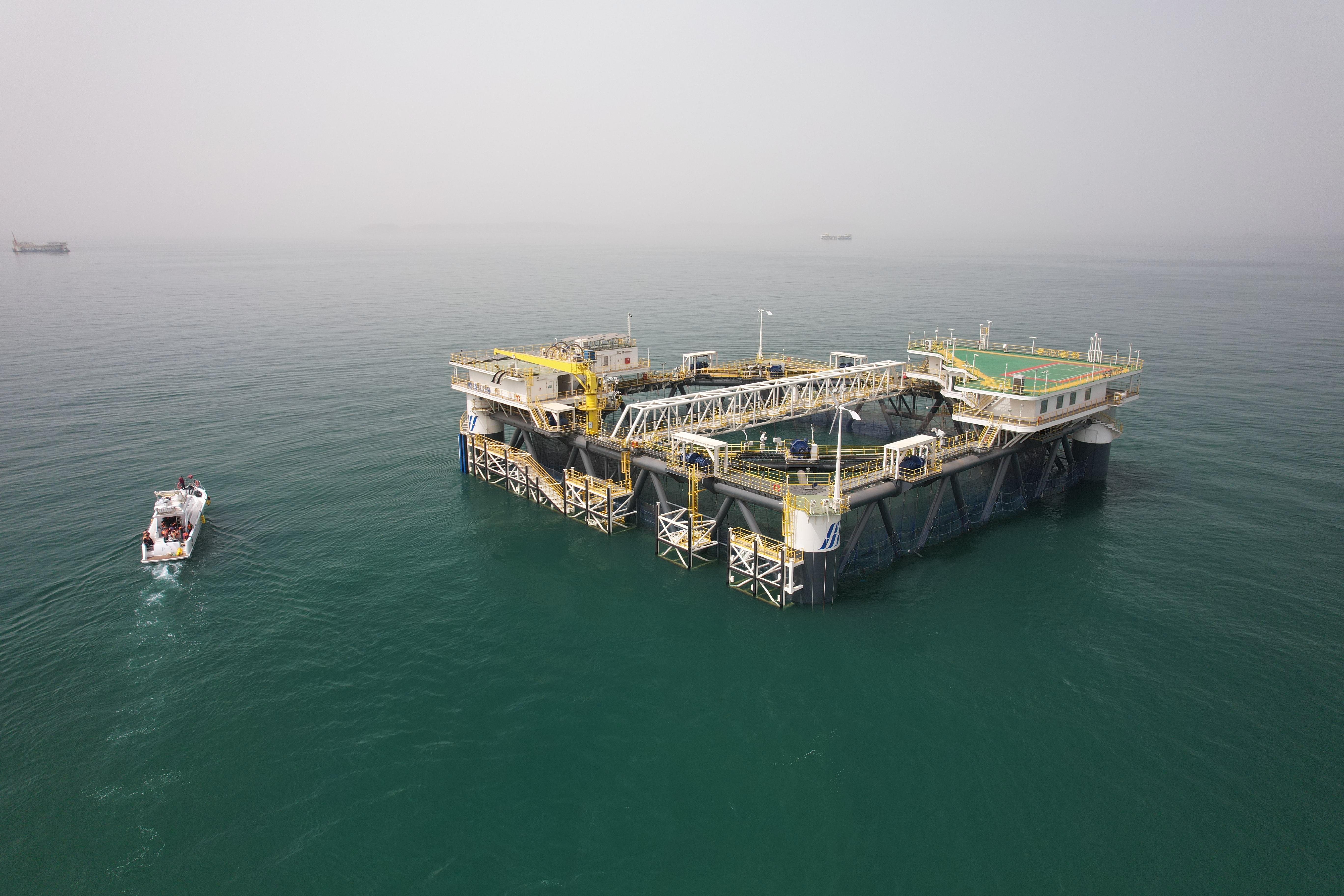 從空中俯瞰,幾座龐然大物立于海面。它們是中集來福士海洋工程有限公司自主研發(fā)的“經海”系列深遠海智能網箱。站在船頭眺望,智能網箱平臺如同“海上城堡”矗立在海天之間。這些單體網箱底座長寬均為68米,包圍水體9.4萬立方米,可養(yǎng)殖100萬尾魚。
